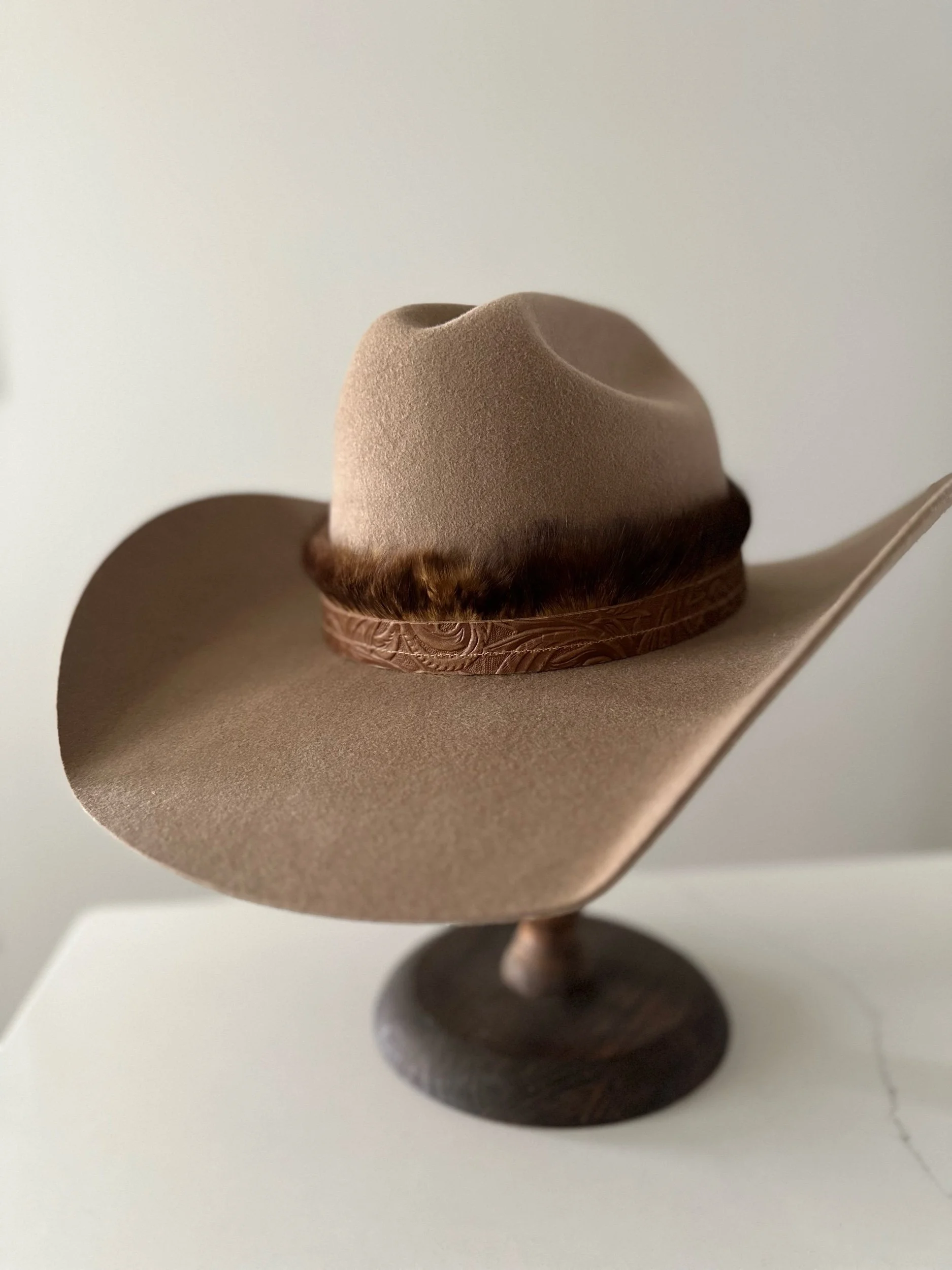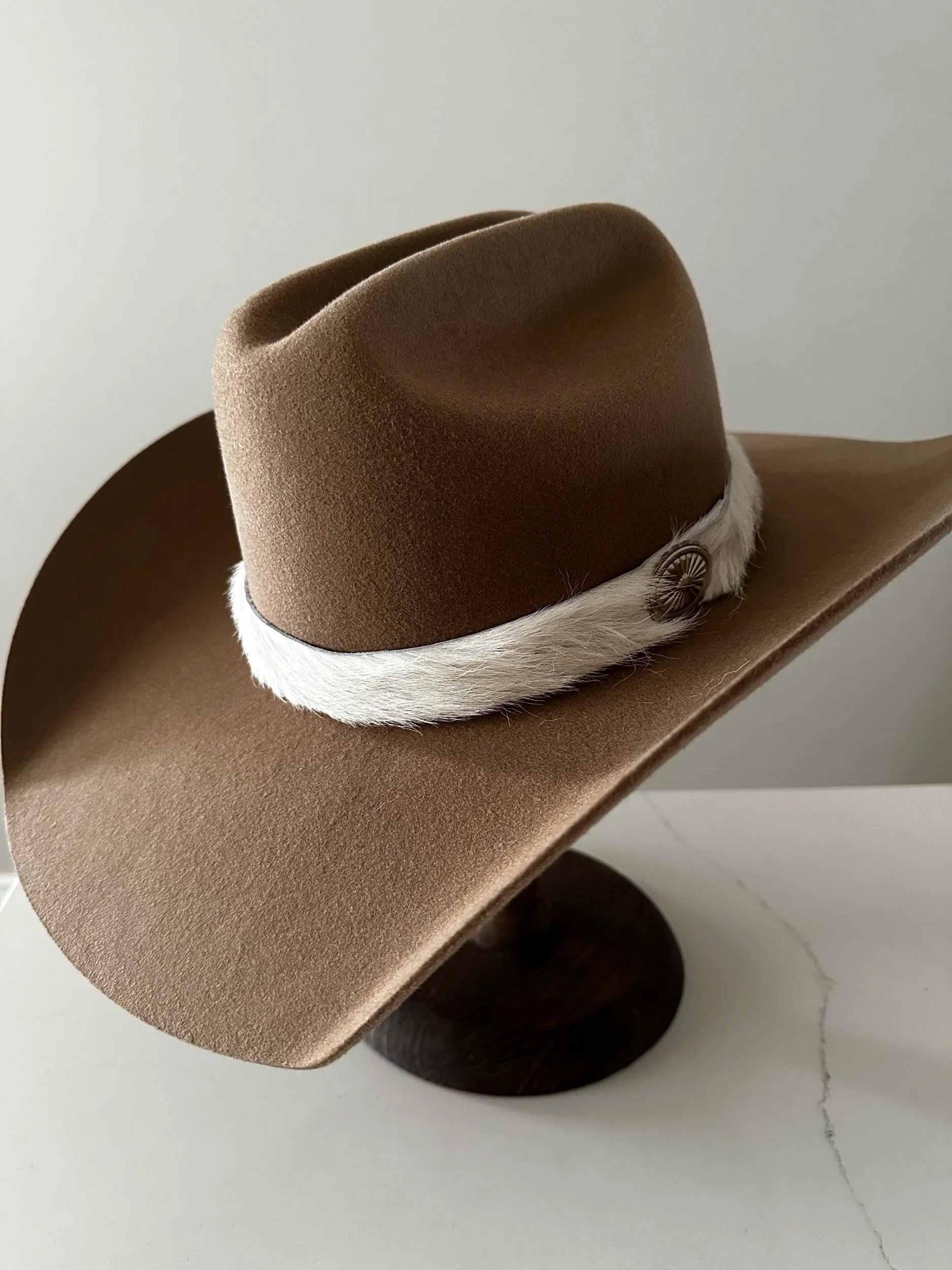 Fluffy and smooth cowhide adorned with concho clips and additional holes to accommodate various hat sizes.